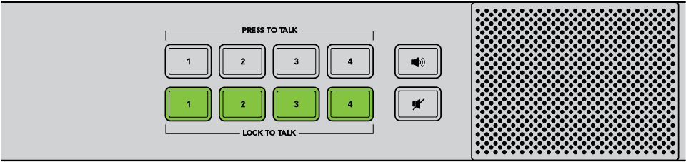 ATEM Studio Converter’s control panel buttons are used for talkback, enabling or disabling program audio, and muting the speaker. The above illustration shows all the LTT buttons activated.