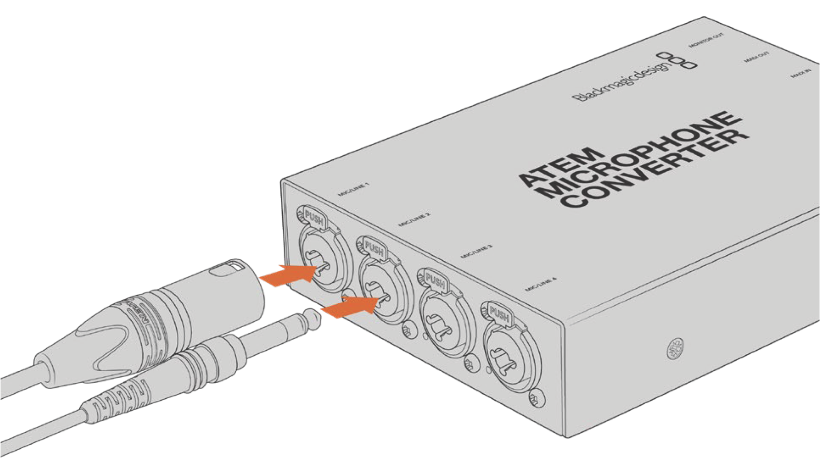 Connect mic or line level analog audio to the ATEM Microphone Converter’s XLR or TRS inputs