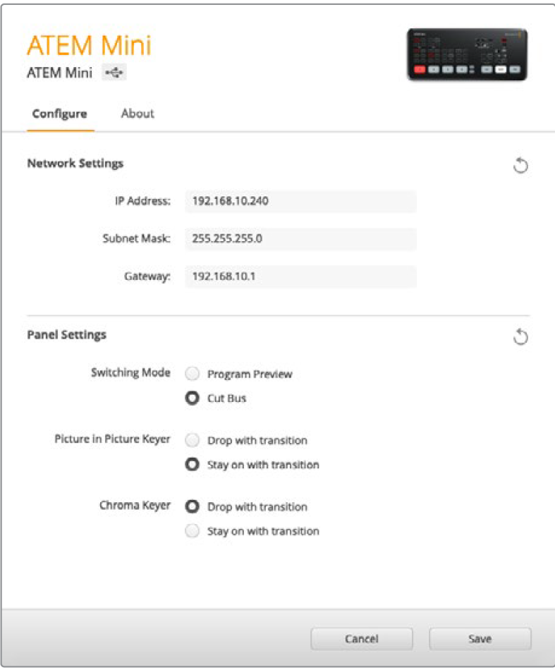 Change network settings using the ‘configure’ tab in Blackmagic ATEM Setup.