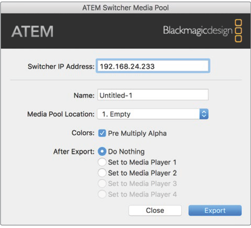 The first time the Photoshop export plug-in is run, it will ask you to select your switcher location. This is the IP address of the switcher so the plug-in can find the switcher to communicate with. By default, the IP is set to 192.168.10.240, which is what the switcher IP address is originally set to when first sold. If you want to export several versions of the same Photoshop file, you can use the export plug-in window to name each exported file and also choose whether to set the files to a media player after export.
