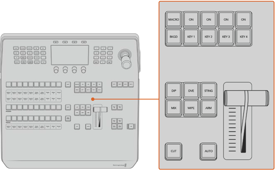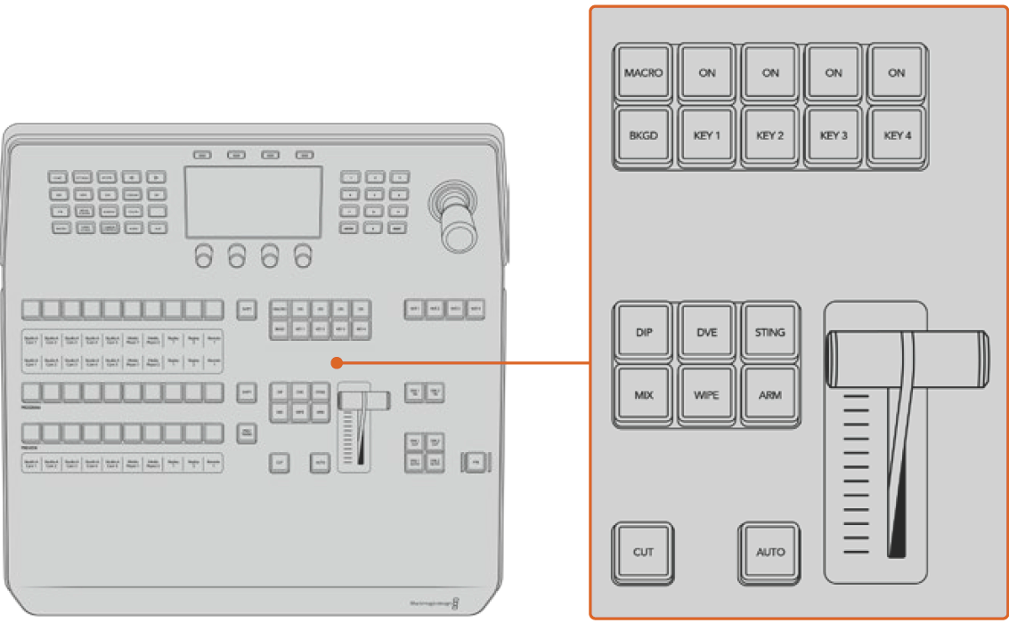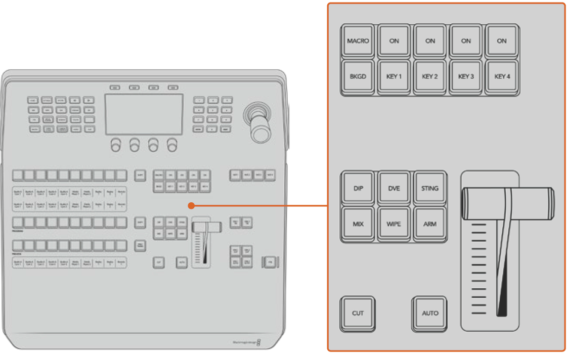The AUTO button illuminates red for the duration of the transition and the fader bar indicator illuminates with sequential LEDs to indicate the progress of the transition. If the software control panel is active, the virtual fader bar also updates to provide visual feedback on the progress of the transition.