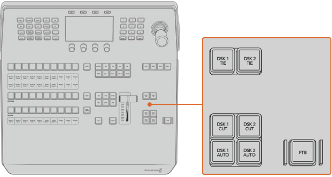 The DSK TIE button will enable the DSK on the preview output, along with the next transition effects, and tie it to the main transition control so that the DSK can be taken to air with the next transition.