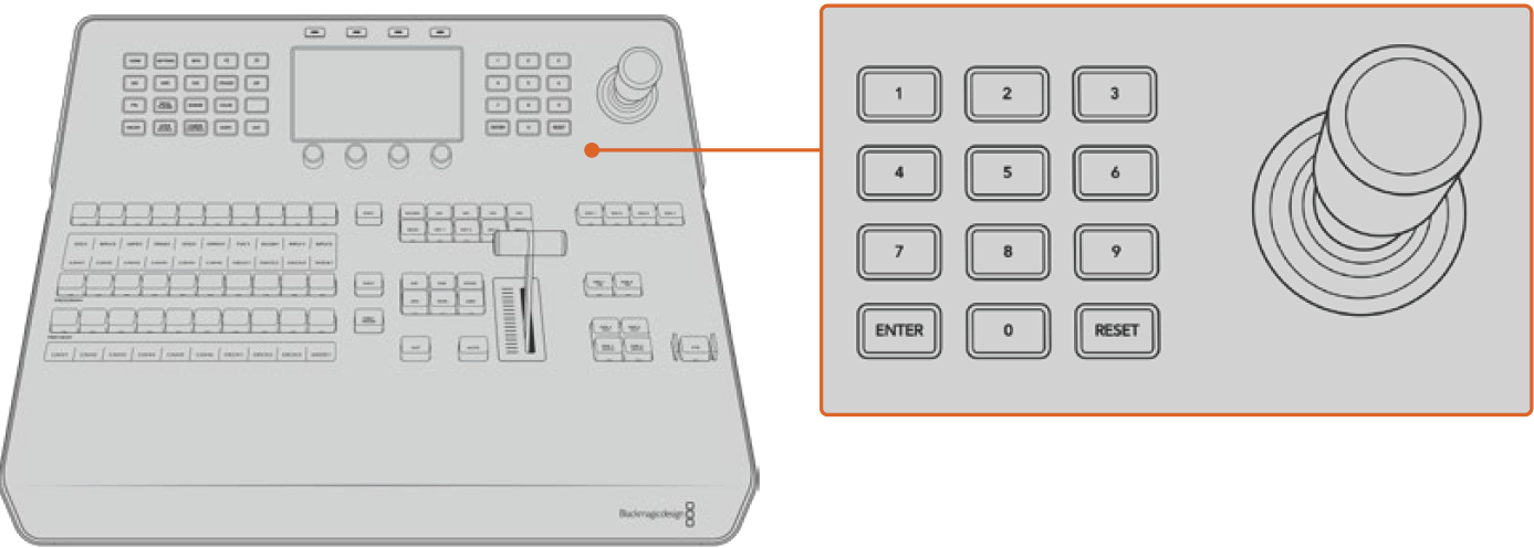 The Joystick is a 3-axis joystick that is used to size and position keys, DVEs and other elements. On larger ATEM switchers with an RS-422 ‘remote’ port, the joystick can also be used to control VISCA PTZ cameras.