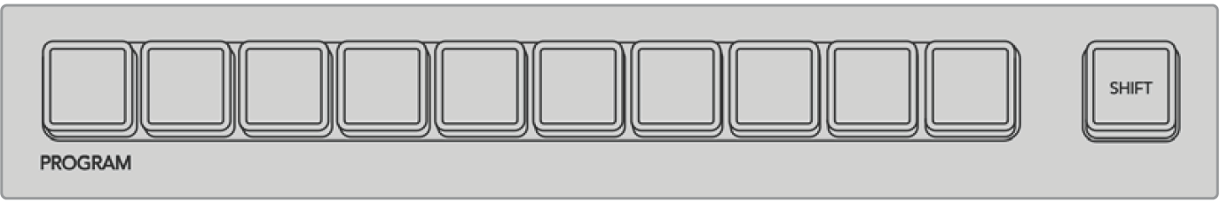 The program bus is used to hot switch background sources to the program output. The source currently on air is indicated by a button that is illuminated red. A blinking red button indicates that the shifted source is on air. Pressing the SHIFT button will display the shifted source.