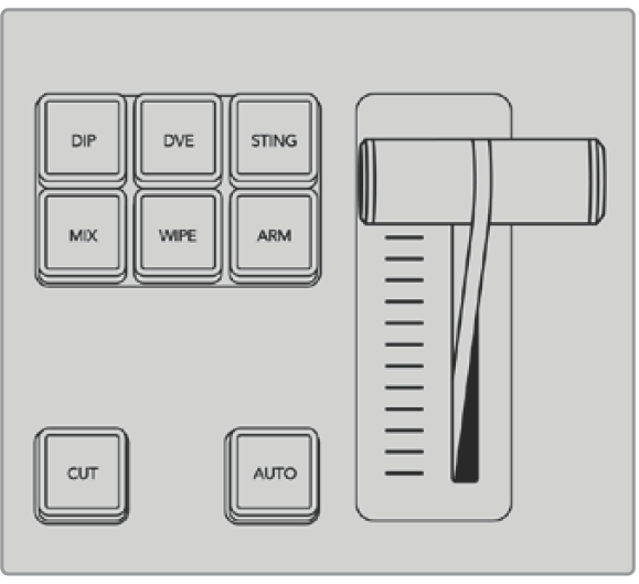 The AUTO button illuminates red for the duration of the transition and the fader bar indicator updates to indicate the progress of the transition. If the software control panel is active, the virtual fader bar updates simultaneously.