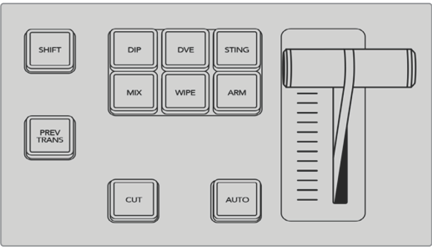 The SHIFT button provides a global shift and is used to shift the program, preview, and select buses along with the label. It also provides a shift for the transition type and joystick and other menu functions.