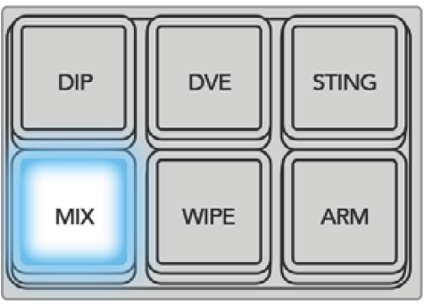 The transition type buttons allow the operator to select one of five types of transitions; mix, wipe, dip, DVE, and stinger, labeled STING. Transition types are selected by pressing the appropriately labeled transition type button. The button will illuminate when selected.