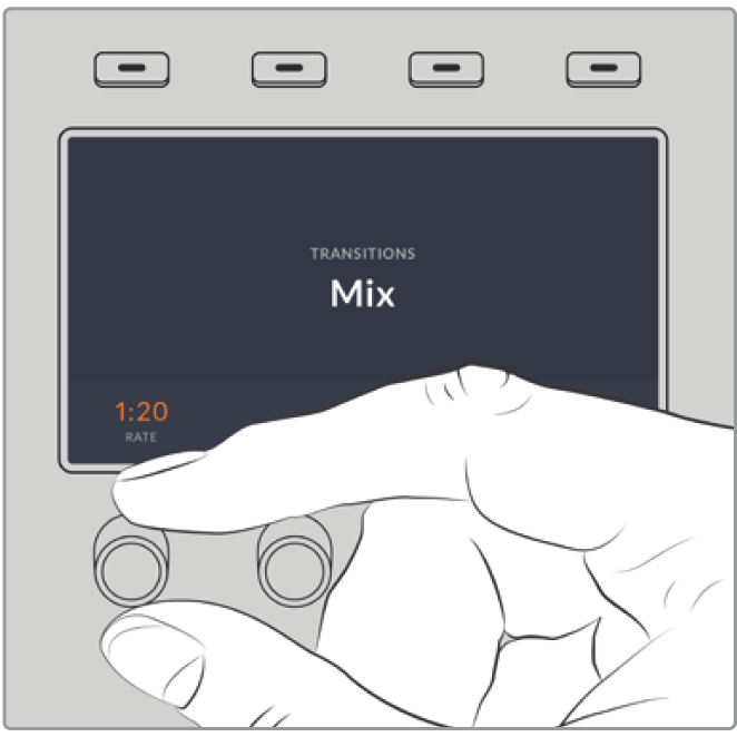 In the transition settings, use the corresponding LCD control knob to adjust the dip rate. You can also enter a rate duration using the number pad. Select a dip source.