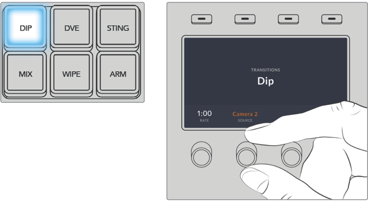 Press the DIP button to select the dip transition type. The LCD menu will automatically display the transition settings.