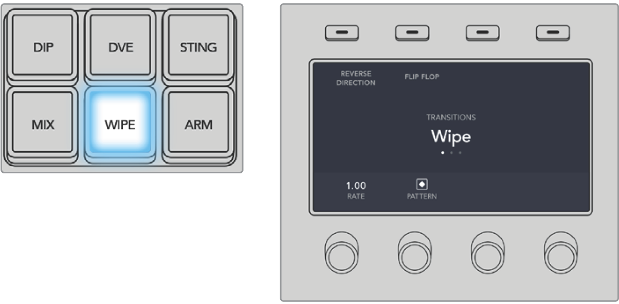 Press the WIPE button to select the wipe transition type. The LCD menu will automatically display the transition settings.