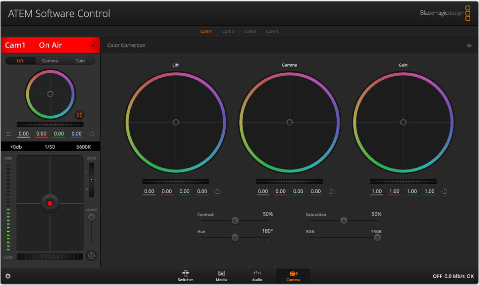 Clicking on the ‘camera’ button in ATEM Software Control opens the camera control feature that lets you control Blackmagic Pocket Cinema Camera 4K and 6K from your ATEM Mini. Camera settings such as iris, gain, focus, detail and zoom control are easily adjusted using compatible lenses, plus you can color balance cameras and create unique looks using the DaVinci Resolve primary color corrector that’s built into the camera.