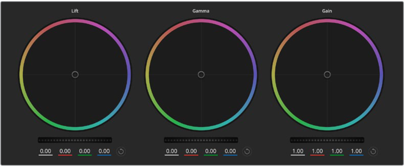 The color wheel is a powerful feature of the DaVinci Resolve color corrector and used to make color adjustments to each YRGB channel’s lift, gamma and gain settings. You can select which setting to adjust by clicking on the three selection buttons above the color wheel.