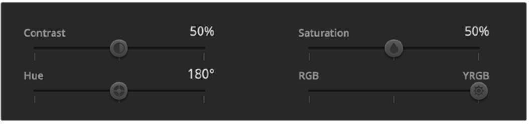 The Contrast setting gives you control over the distance between the darkest and lightest values of an image. The effect is similar to making opposing adjustments using the lift and gain master wheels. The default setting is 50%.
