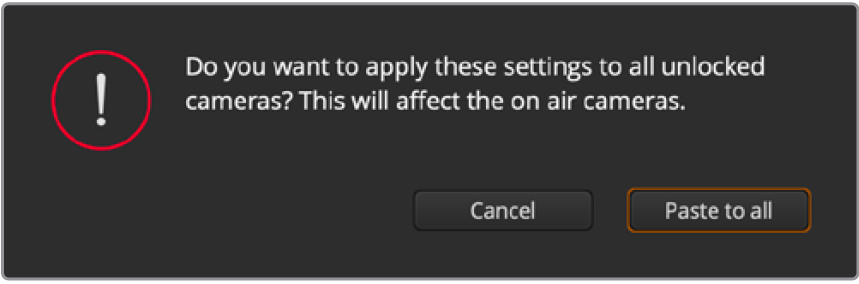 When applying ‘paste to all’, a warning message will appear asking you to confirm your action. This is so you don’t accidentally paste new settings to any unlocked cameras that are currently on air.