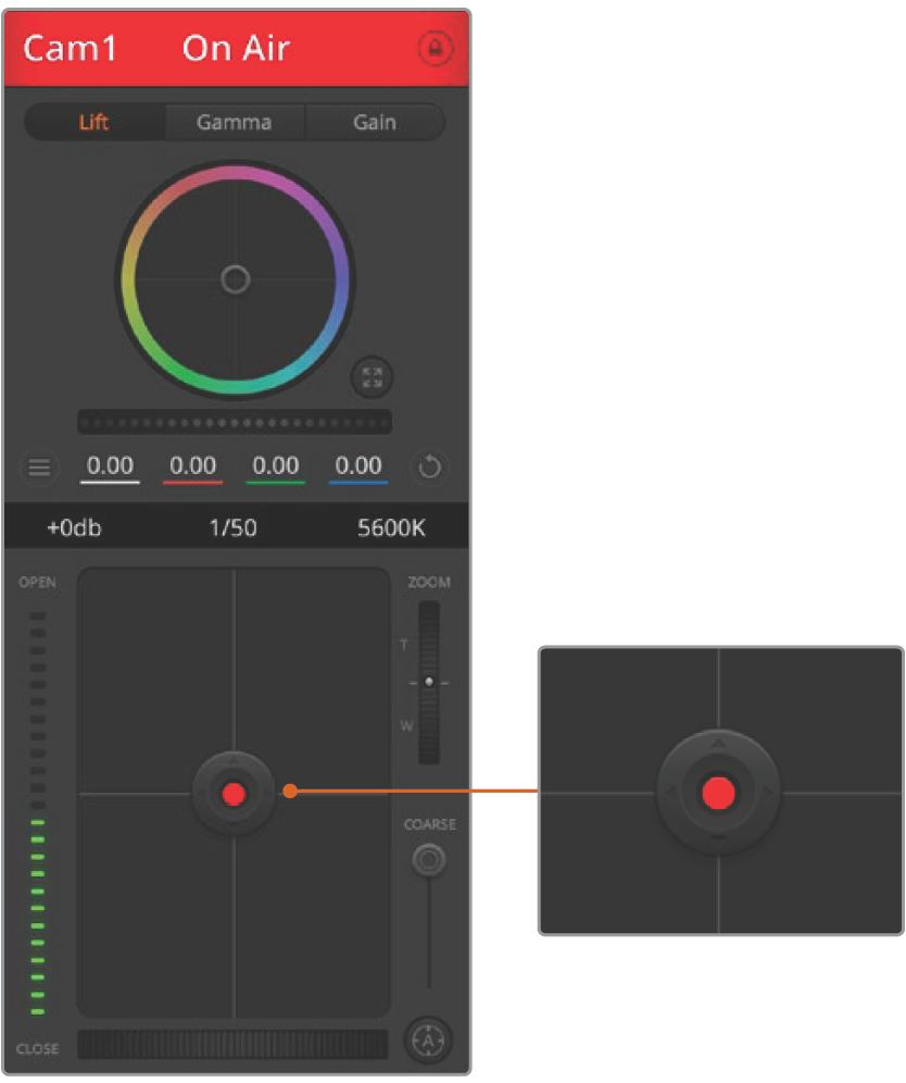The iris/pedestal control is located within the cross hairs of each camera controller. The control illuminates red when its camera is on air.