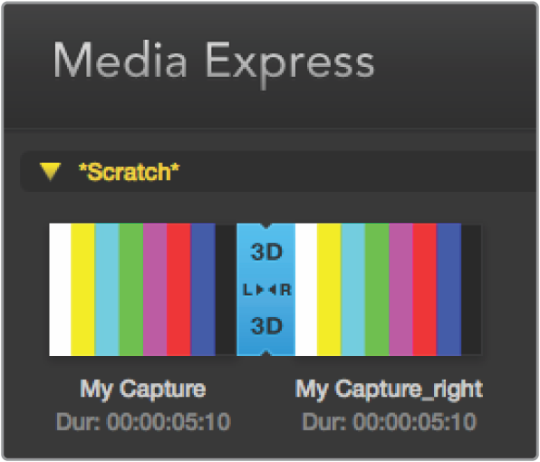 When Media Express is used with a Blackmagic Design video hardware model that supports dual stream 3D, you can create left and right eye 3D video clips by capturing 2 streams of HDSDI video simultaneously.