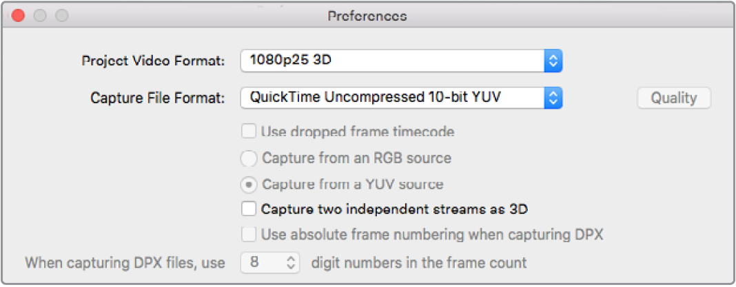 Go to Media Express>preferences on Mac, or edit>preferences on Windows or Linux. Select your ‘project video format’ from the dropdown menu at the top of the preferences window. You can choose from a range of compressed and uncompressed capture formats, or even a DPX image sequence from the ‘capture file format’ drop down menu. Video will be captured in the chosen format and saved as a QuickTime movie. You can also choose to capture an RGB source using a YUV codec or vice versa.