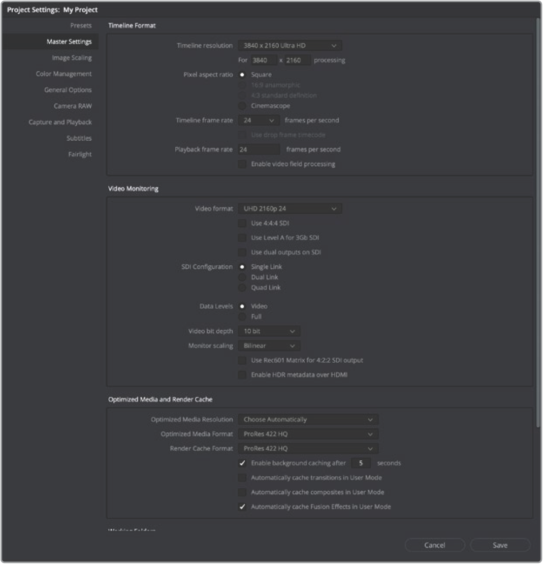 Use the ‘project settings’ window to set your timeline format and video monitoring options.