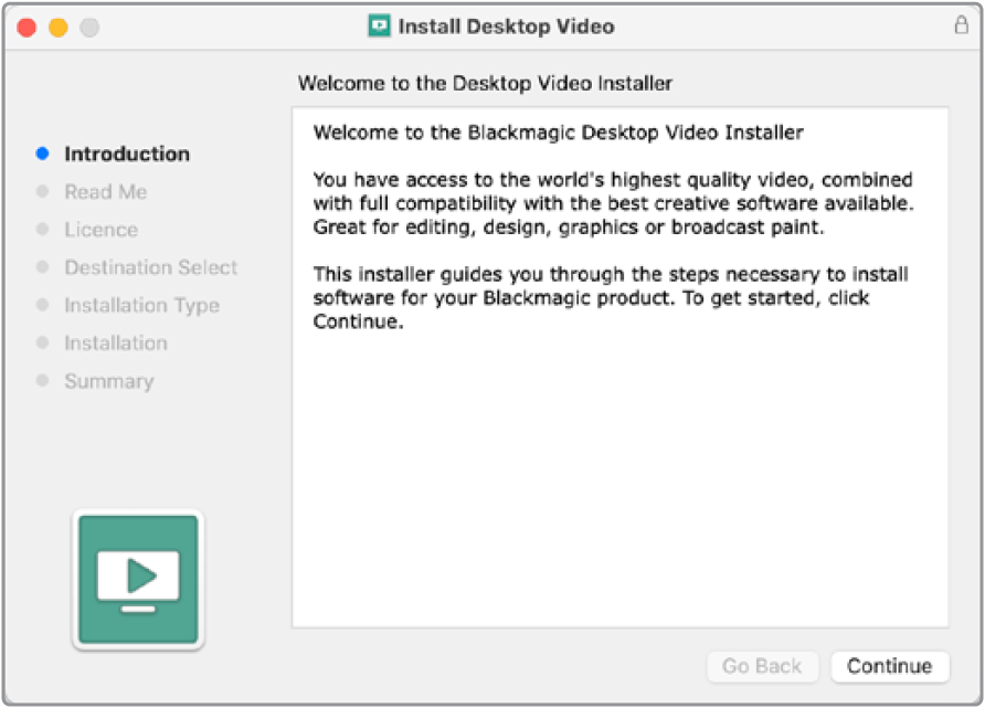 Click the ‘continue’, ‘agree’ and ‘install’ buttons to install the software. If you are installing Desktop Video for the first time, installation has a few extra steps that are described below.