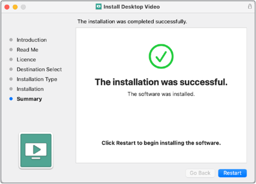 Back in Desktop Video Installer, complete the software installation by clicking ‘restart’.
