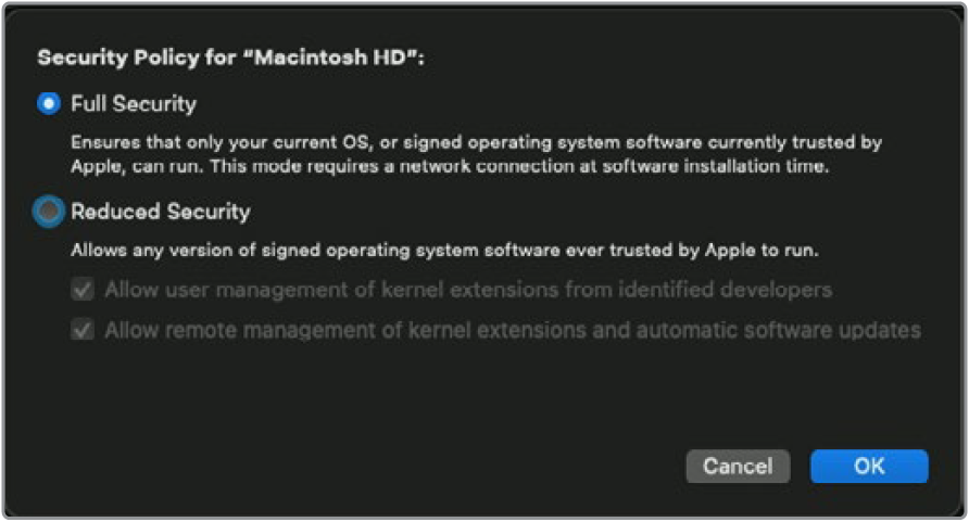 From Desktop Video 12.2 or later, it is no longer necessary to have ‘reduced security’ enabled as your Mac’s system security policy. If you had ‘reduced security’ set when installing previous versions of Desktop Video, it is now advisable to reset your M1 Mac’s security policy to ‘full security’.