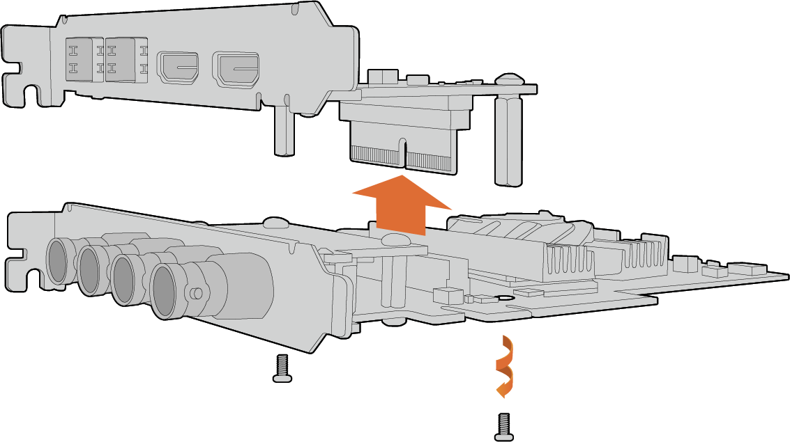 Hold the base DeckLink card by its edges and gently lift the mezzanine card until its bridge connector is released from the slot.