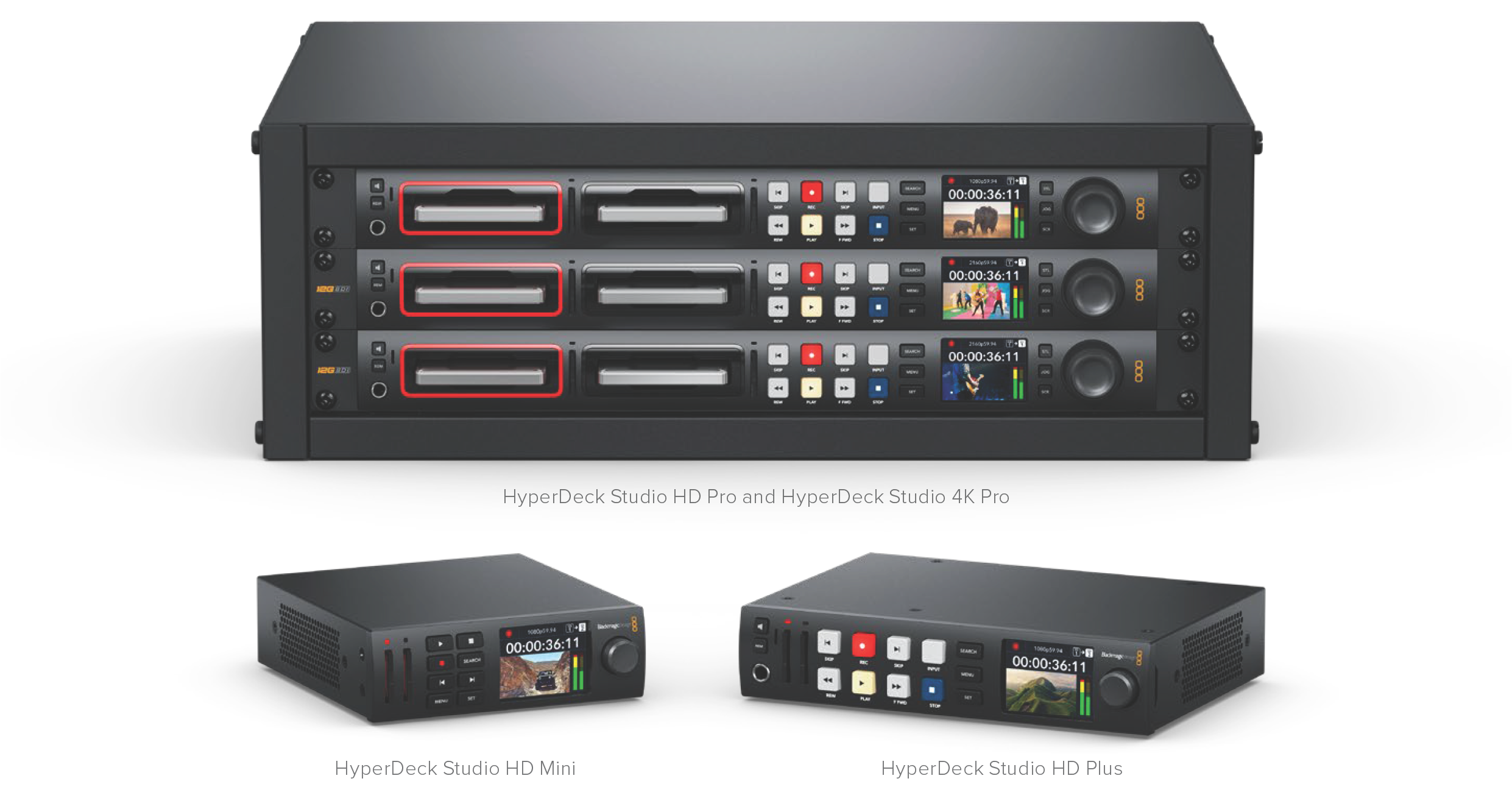 Your Blackmagic HyperDeck disk recorder is part of a family of HD and 4K disk recorders designed to fit your own production workflow. HyperDeck Studio HD Pro and HyperDeck Studio 4K Pro are built to fit inside a single rack unit and are large enough to record and play back files on both SD cards and 9.5mm SSDs.