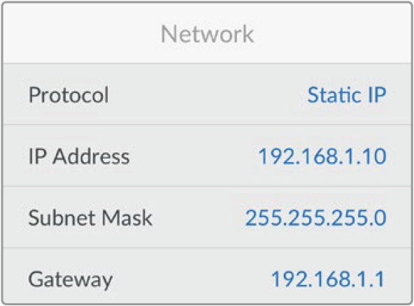 You can find your HyperDeck Studio’s IP address in the smart panel’s ‘network’ screen