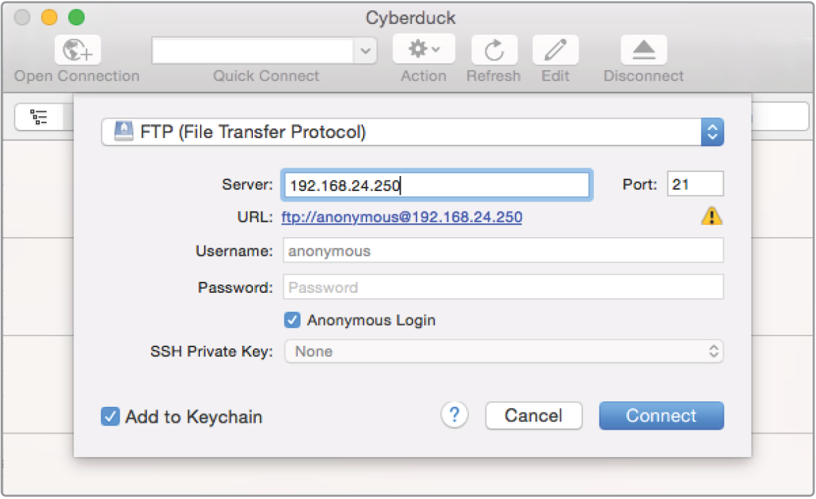 Enter your HyperDeck’s IP address into your TCP application’s connection dialog. The naming and position of this box can vary between applications, but it is usually labeled ‘server’ or ‘host.’ If your FTP program includes an ‘anonymous login’ checkbox, make sure this is checked.