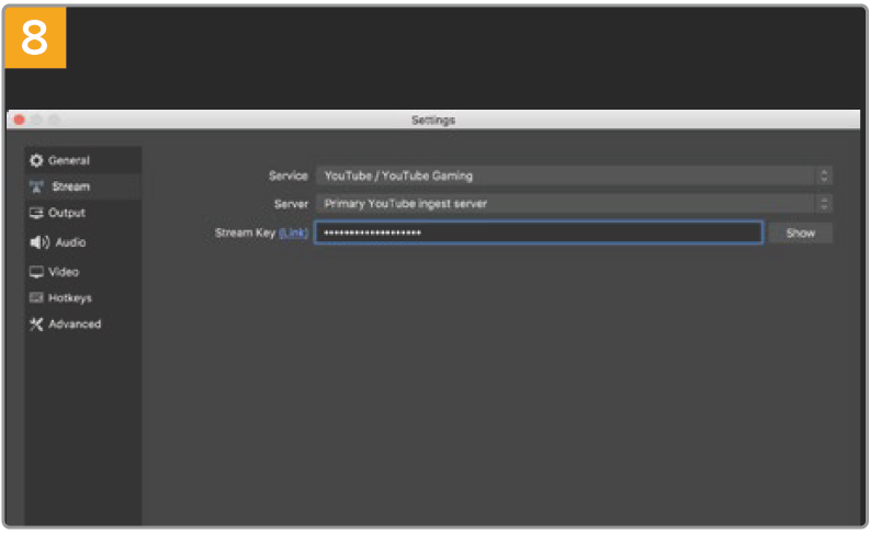Return to Open Broadcaster and open the preferences by clicking on ‘OBS/preferences’ in the menu bar. Select ‘stream’. Now paste in the stream key you copied from YouTube and click ‘OK’. You will now see the video from your HyperDeck in the Open Broadcaster streaming preview window.