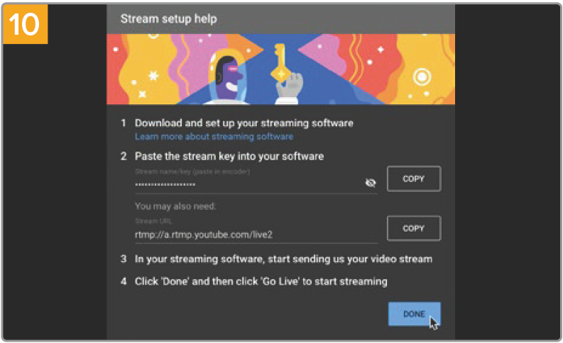 YouTube will now generate a stream key that will direct Open Broadcaster to your YouTube account. Click the ‘copy’ button next to the stream key. Copy the stream key that you will now paste into Open Broadcaster.