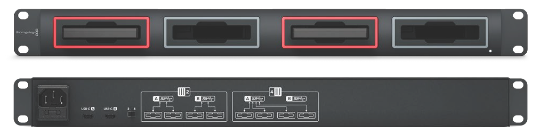 Plug SSDs or HDDs into any of Blackmagic MultiDock’s 4 drive bays.