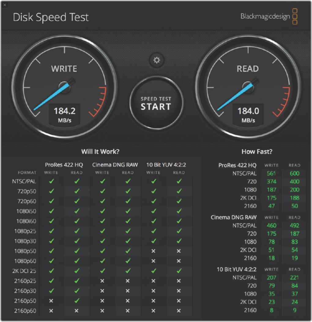 You can use Blackmagic Disk Speed Test to measure the read and write performance of your storage media to make sure it is fast enough for your needs. Disk Speed Test is included with Desktop Video software or available as a standalone application via the App store for macOS.