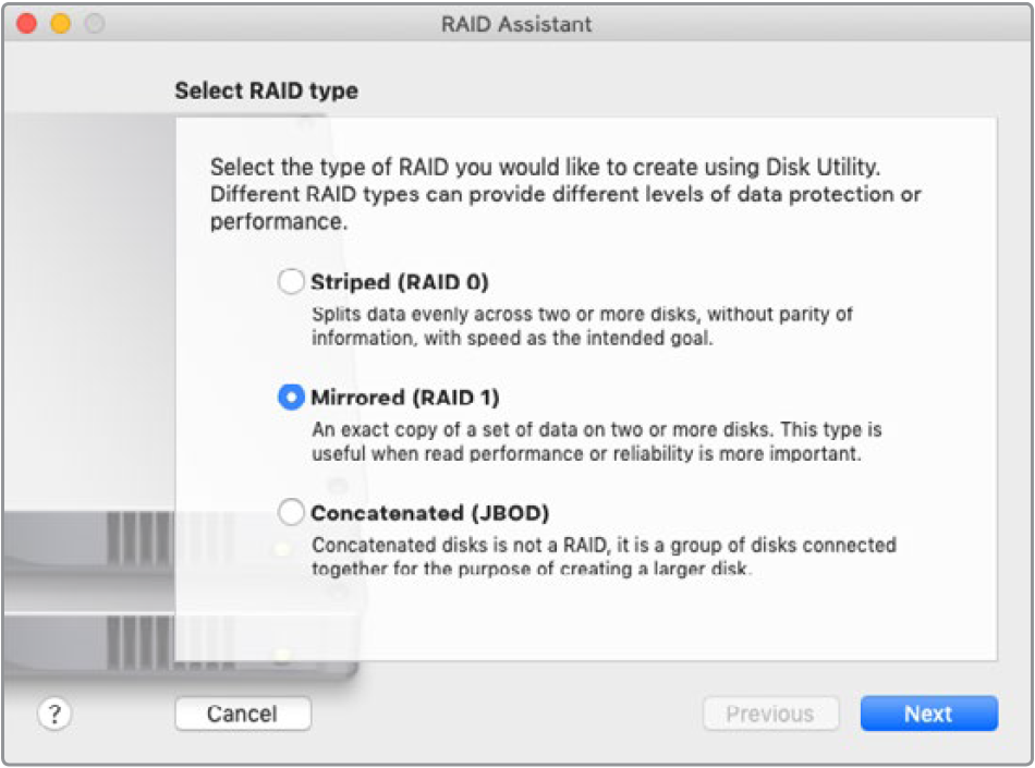 Select ‘mirrored’ using RAID assistant on Mac OS to configure your drives as RAID 1.