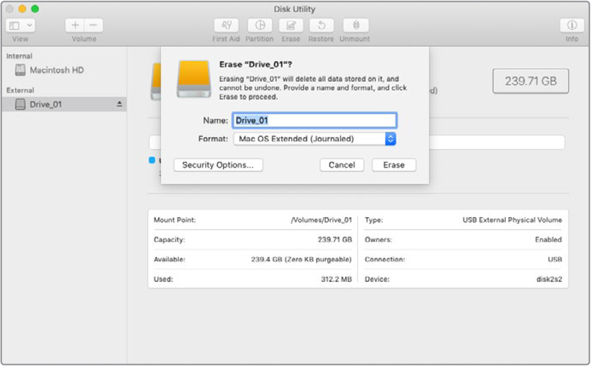 Select Mac OS Extended (Journaled) or exFAT from the ‘format’ drop down menu and then click ‘erase’. Your new drive will quickly be formatted and made ready for use with Blackmagic MultiDock.