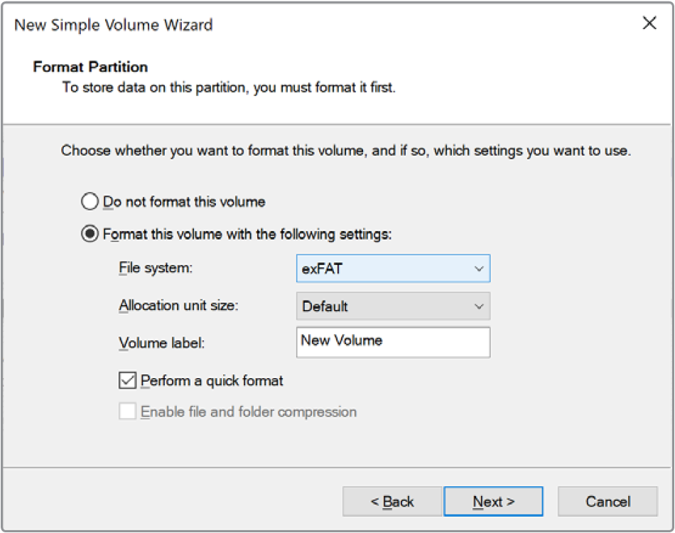 Windows uses the Disk Management application to format a new drive in the exFAT format.
