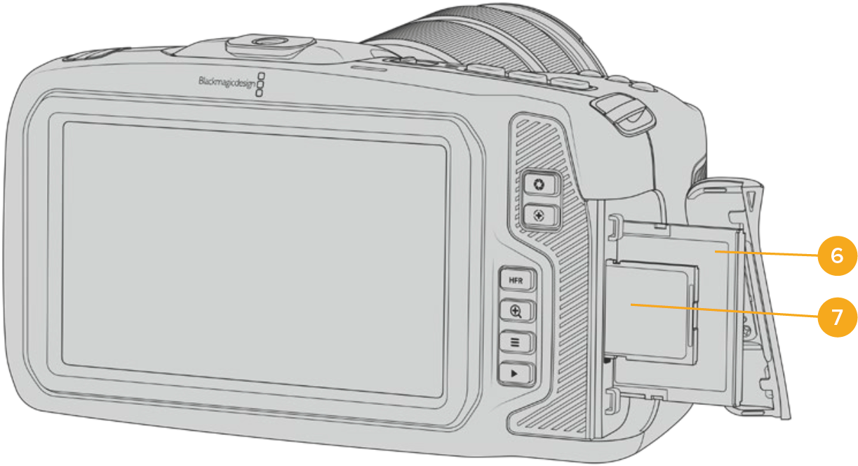 Rear of Blackmagic Pocket Cinema Camera 6K Pro and 6K G2. Blackmagic Pocket Cinema Camera 6K G2 does not feature ND Filter buttons.