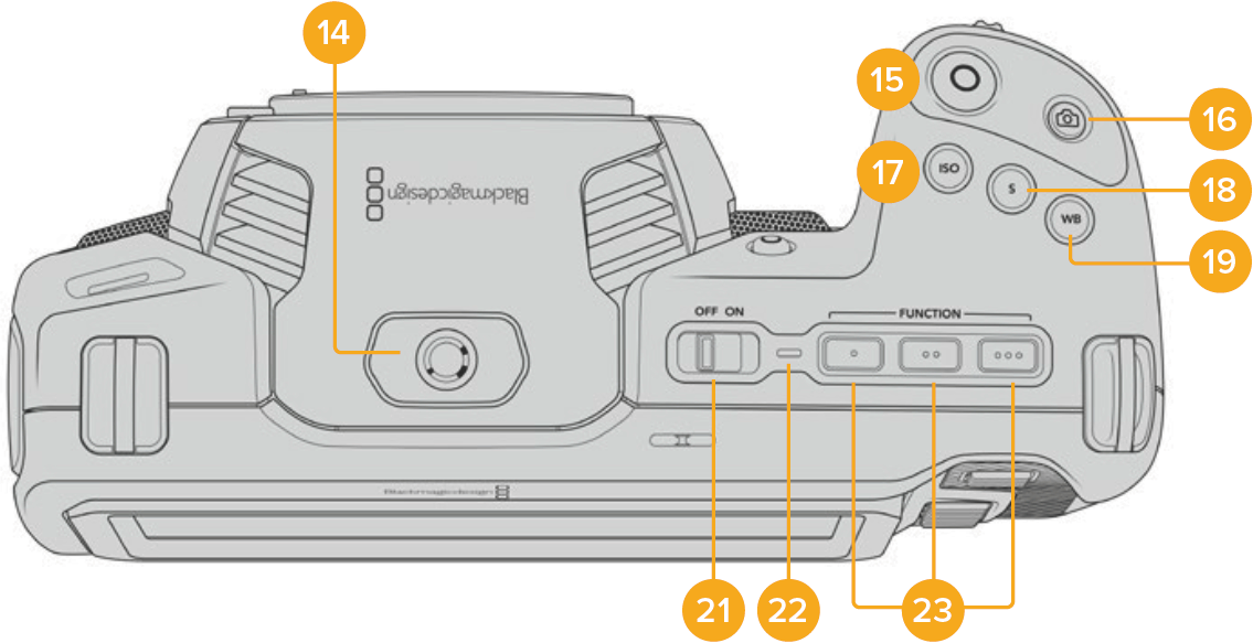 The settings wheel lets you adjust the aperture of compatible lenses mounted to your camera. With the touchscreen facing you, rotate the wheel left to open the iris, and right to close. The settings wheel is also used to adjust white balance, shutter angle and ISO settings. You can also use the settings wheel in conjunction with the ‘focus zoom’ button to adjust the magnification level of the optional electronic viewfinder. Press the corresponding buttons on the top of the camera, then make your selection by rotating the settings wheel. After making your selection, press the settings wheel to quickly dismiss the selection menu.