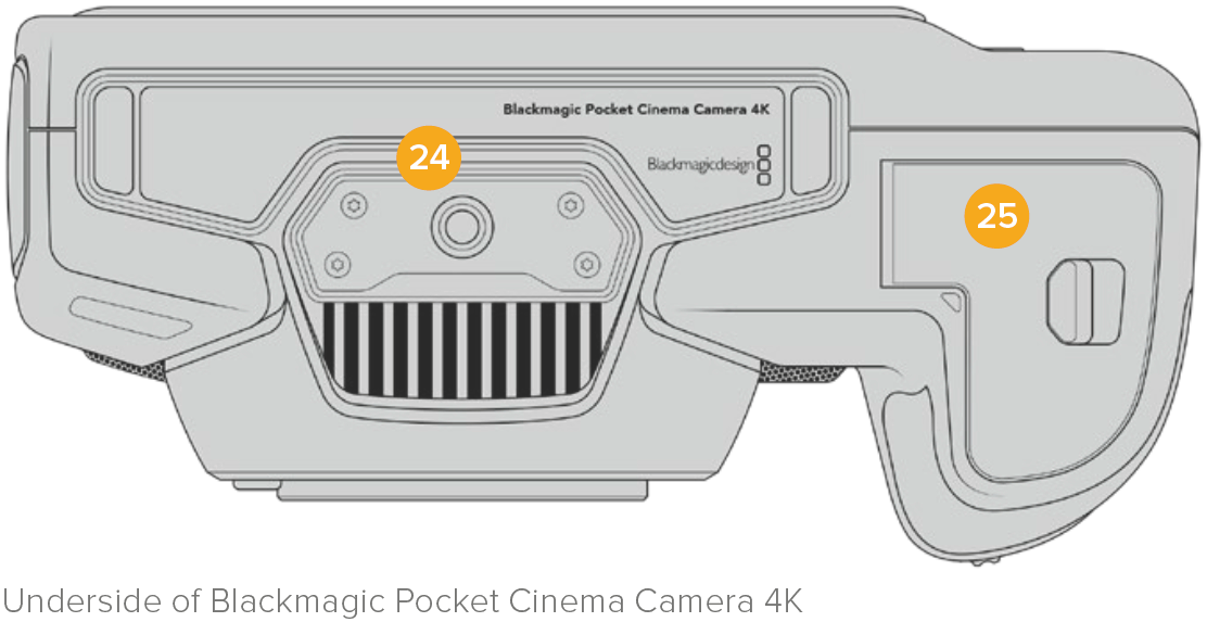 Attach your Blackmagic Pocket Cinema Camera 4K or Pocket Cinema Camera 6K Pro or 6K G2 to a tripod, rigging or accessories using the bottom 1/4-20 mounting point. Pocket Cinema Camera 6K Pro and 6K G2 have two 1/4 inch mounting points on the underside.