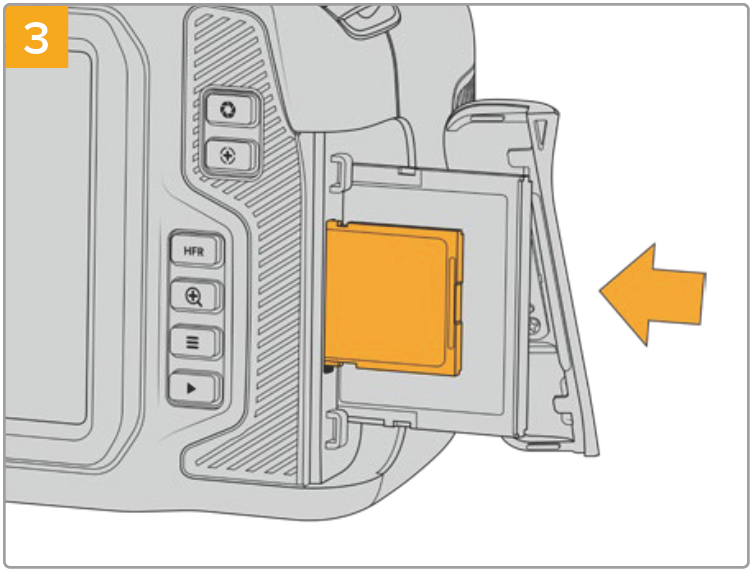 Insert the CFast card into the CFast card slot until you feel it lock into place. The card should insert easily without the need for excessive force. To remove a CFast card, gently push the CFast card in and then release to eject it.