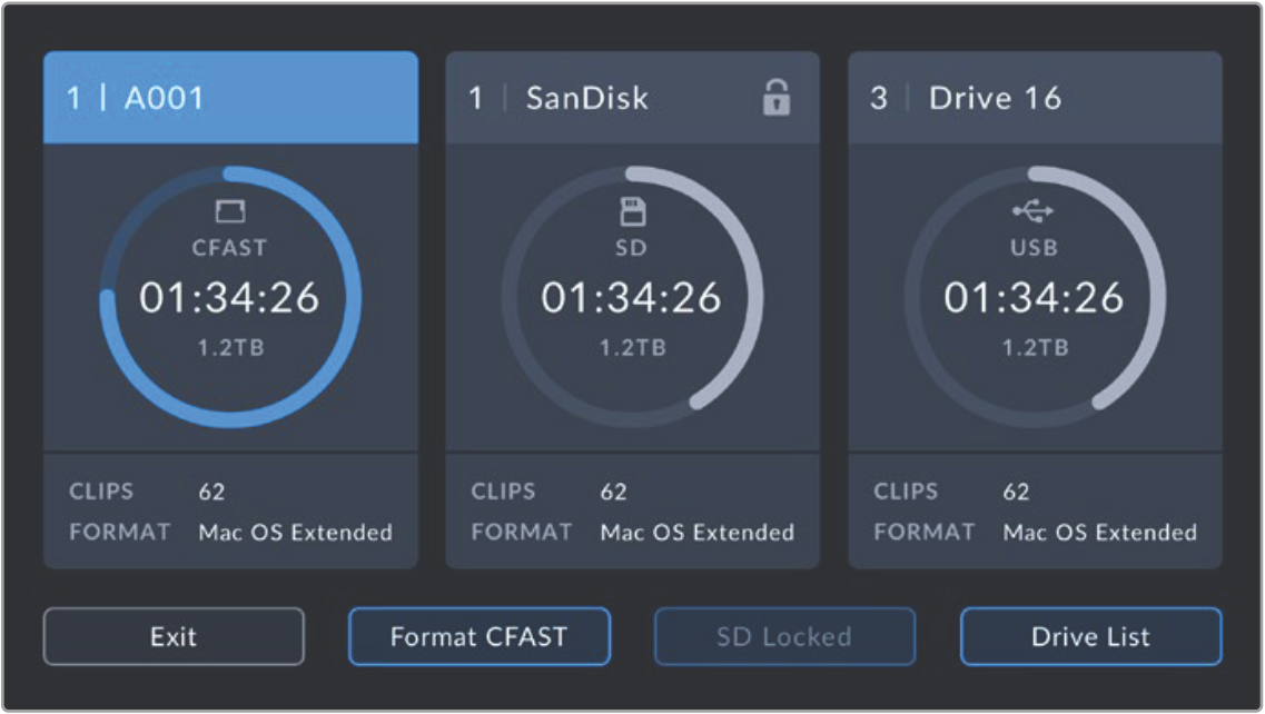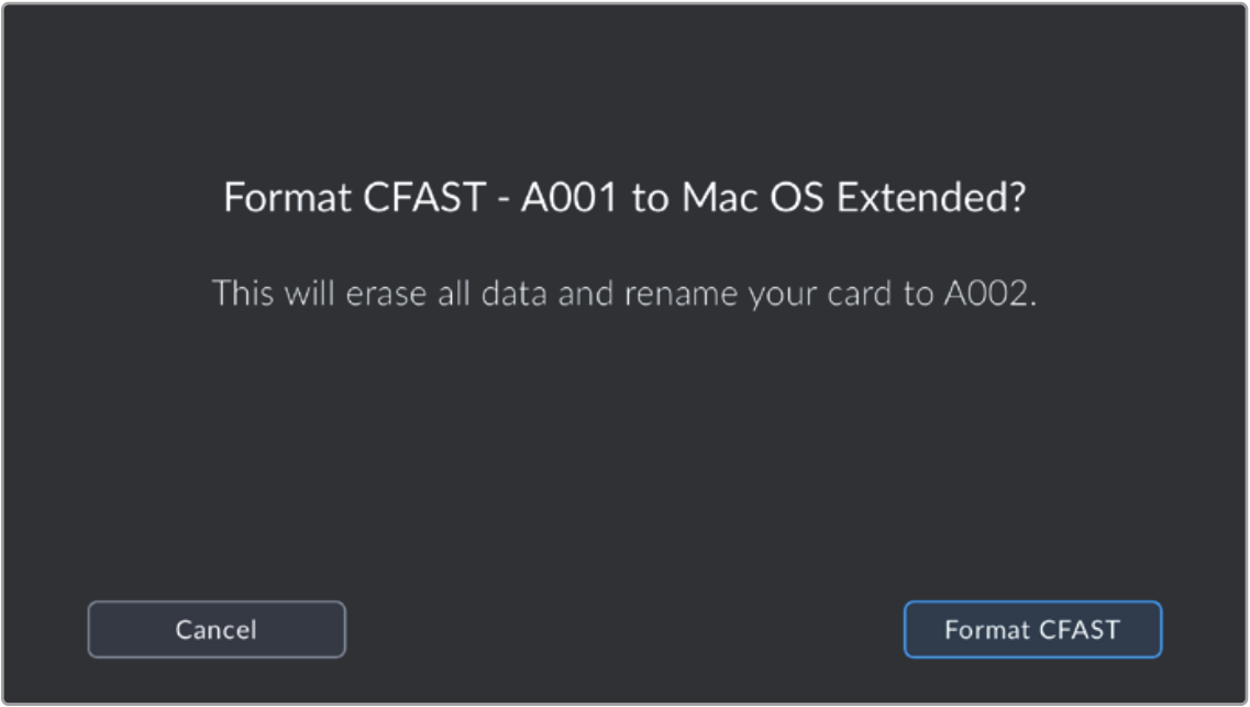 You can format your CFast cards, SD cards or USB-C flash disks using the ‘format card’ feature on your camera’s storage and formatting menu, or via a Mac or Windows computer. For best performance, we recommend formatting storage media using your camera.