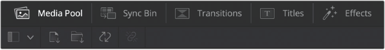 Click on these tabs to open the media toolsets you will use when creating your edit. For example, the first tab is the media pool and you can see it is already selected. The other tabs are for the sync bin, media transitions, titles and effects.