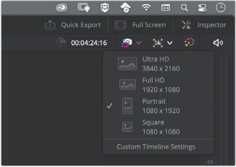 Set the timeline for vertical aspect ratios using the timeline resolution quick menu