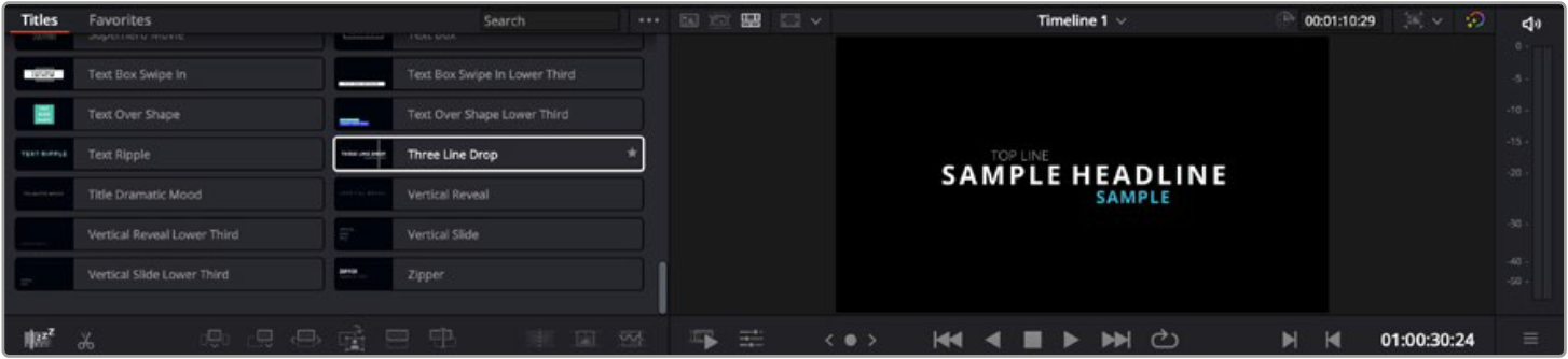 Before you add a title to your timeline you can preview it from the ‘titles’ selection window. This lets you quickly scan through all the available options before making a choice.