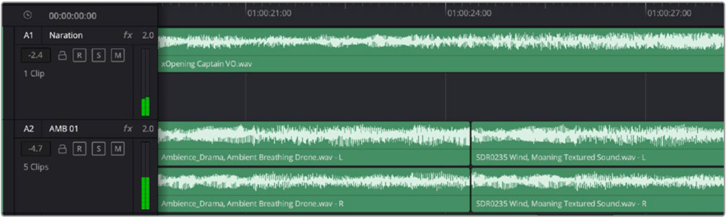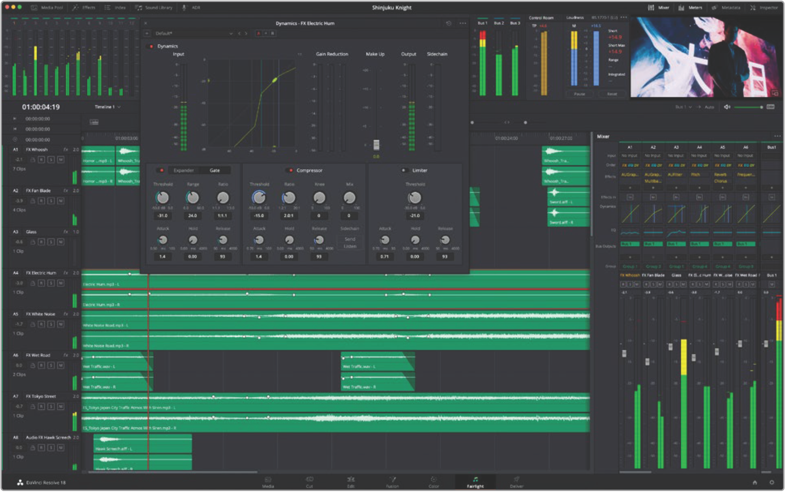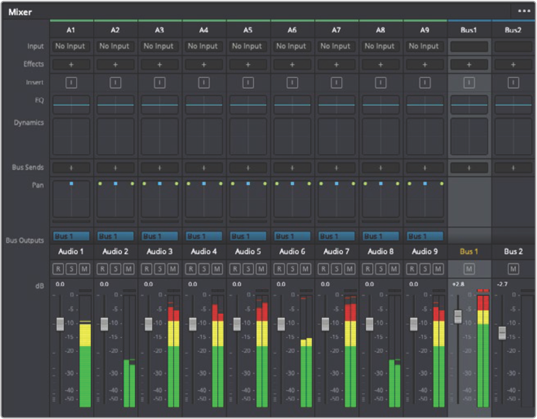 Fairlight has many controls you can use to improve the quality of each audio track. You can add more tracks and arrange buses to organize them, plus add effects like delay or reverb, and generally perfect your audio mix.