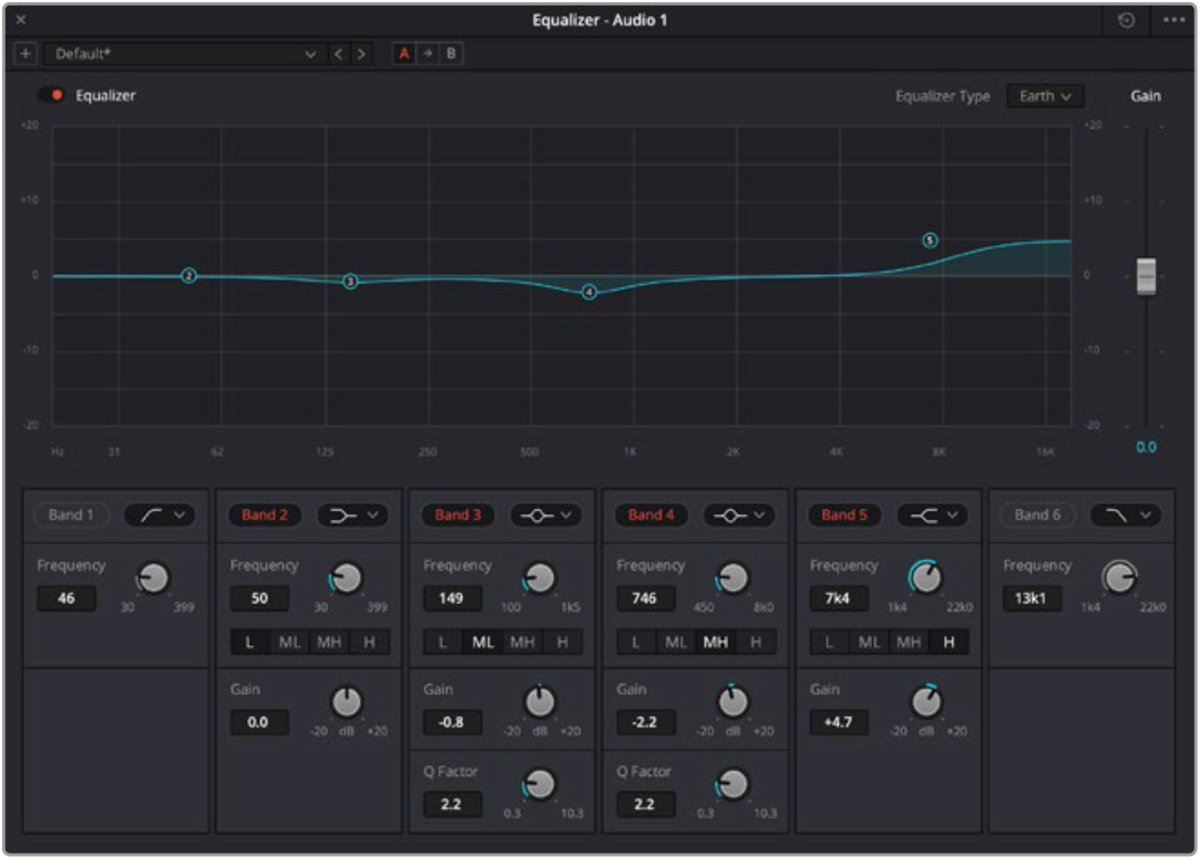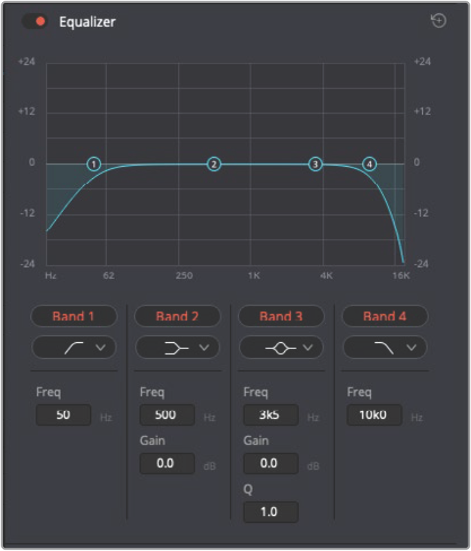 Once you have added EQ to your clip or track, you can adjust the EQ for each band. Note that controls may vary depending on which band filter type is selected.