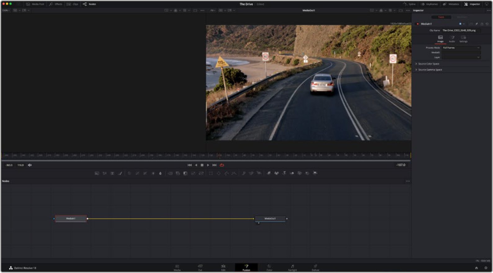 On the Fusion page, your clip is immediately available in a media input node labelled ‘MediaIn’. Every composition will begin with a ‘mediain’ and a ‘mediaout’ node. This mediain node represents the top most clip of your timeline at the playhead, and ignores any clips underneath. Any adjustments you’ve applied to the clip on the edit page, such as transform tools and cropping changes, are also included.