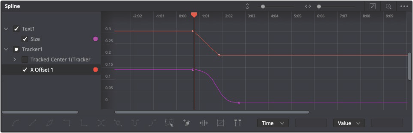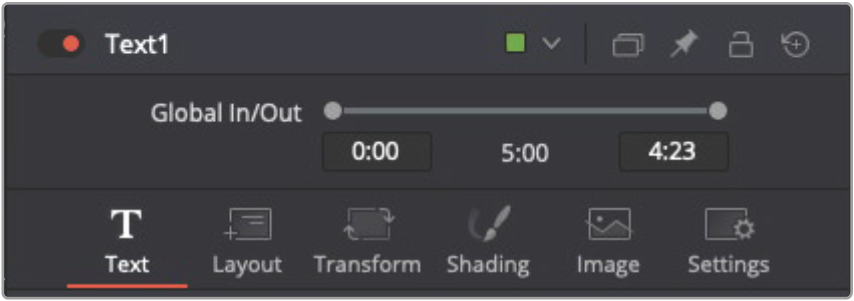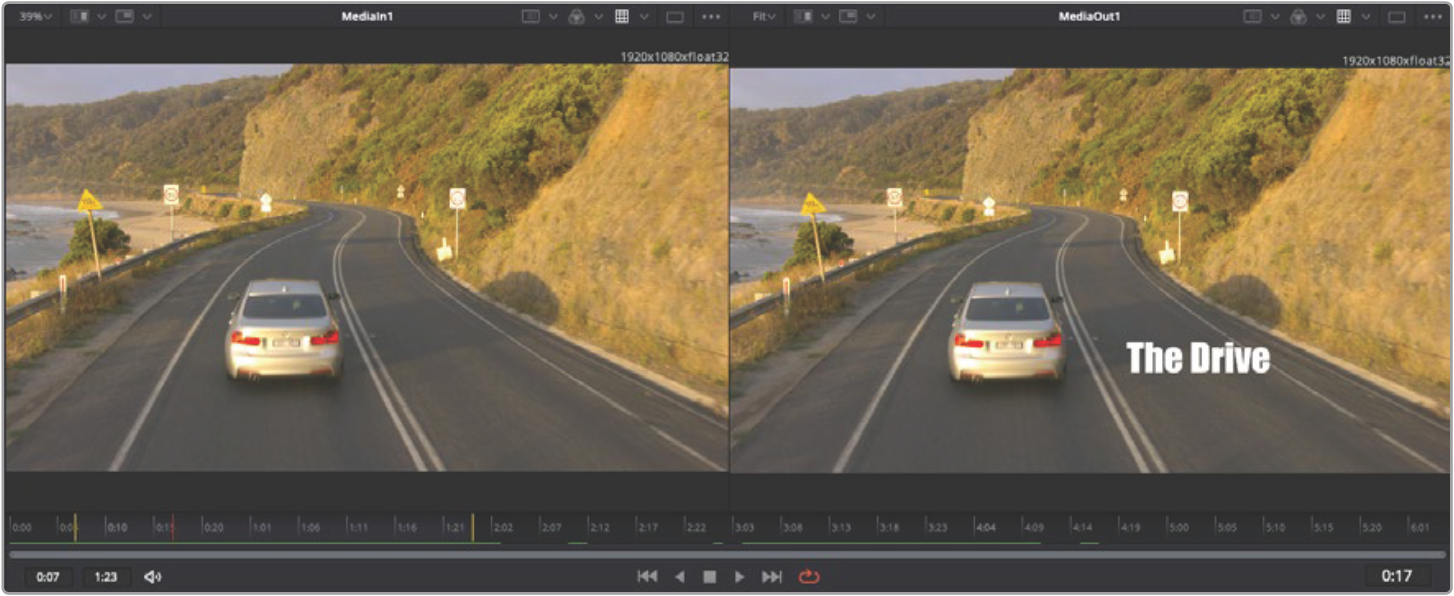 With Fusion, you don’t have to be viewing the node you’re editing, as you can modify one node while viewing another in your composition. For example, you can modify the size and center position of a ‘text+’ node while the merge node is in the viewer, letting you view the text relative to the background.