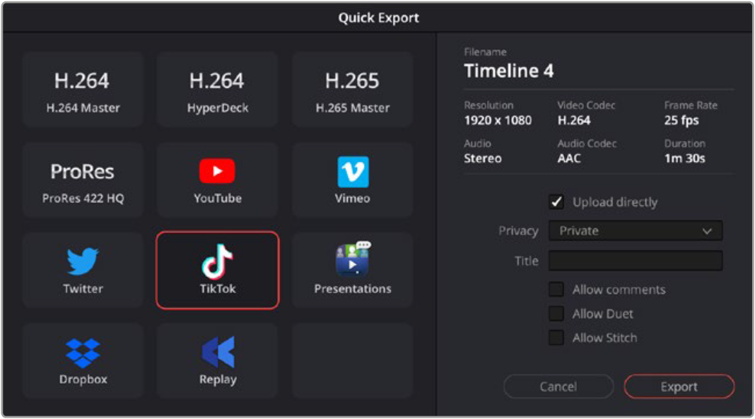 Select a preset to use from the top row of icons in the quick export dialog. If you want to simultaneously upload to your TikTok or YouTube channel, click on the ‘upload directly’ checkbox and fill in the details. Click ‘export’.