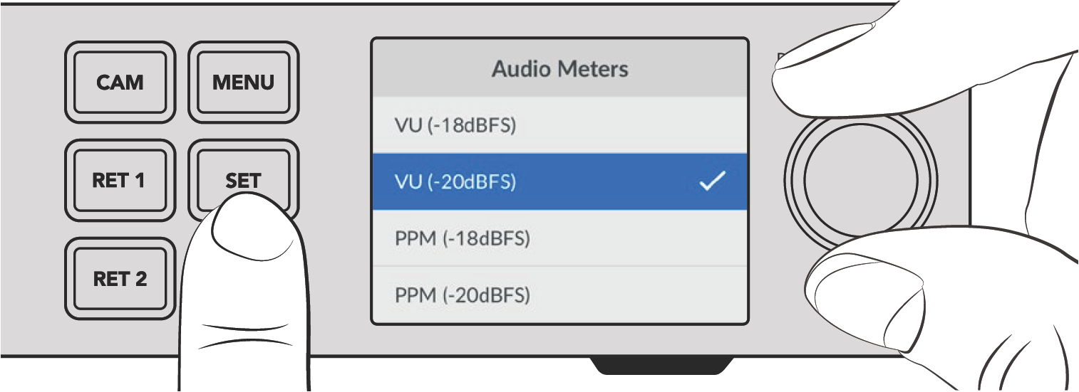 To change the meter type, open the audio meters setting and select your preferred audio meter display from the options. You can select between PPM and VU meters.